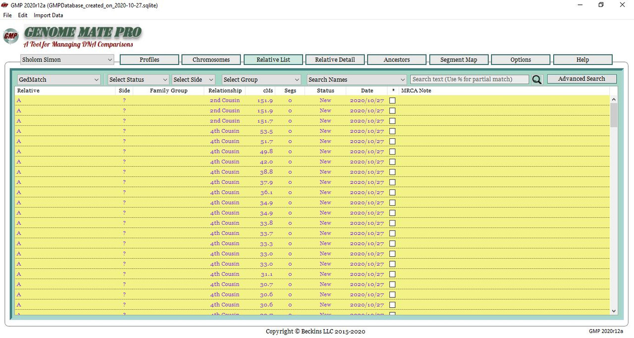 In my case, information for 1,998 matching relatives was added to GMP. - You should still see a whole lotta nuthin’ in the CHROMOSOMES tab. That’s because the one-to-many report from GEDmatch contains information like names, email addresses, and haplogroups, but not segment information. Try going to the RELATIVE LIST tab and choosing GedMatch from the “Select Source” pulldown at the top left.